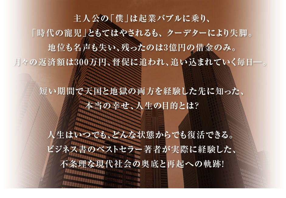 大学卒業後、金融機関を経て、ベンチャー起業をするも、3億円の負債を抱える。